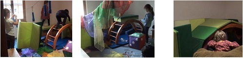 Die Bärenhöhle ist ein Spielort in einem Kindergarten. In der Bärenhöhle kann gebaut, geturnt, gekuschelt werden. Licht und Dunkel können erfahren und nach Gutdünken eingesetzt werden. Es ist ein zweigeteilter Raum mit Brücke, weichen Bauelementen, Seilen, Taschenlampen, Chiffontüchern, kleinen Bällen. Ein Teil des Raums ist abgetrennt durch Vorhänge. Eine Leine führt vom Fenster zum Vorhangraum. Ein riesiger Bär ist Protagonist, Kissen, Gestaltungselement oder Nebensache. Zwei Mädchen spielen in dieser Sequenz während längerer Zeit zusammen und verweilen vertieft im Freispiel.